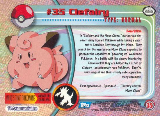 | Card text | In "Clefairy and the Moon Stone," our heroes discover many injured Pokémon while taking a short cut to Cerulean City through Mt. Moon. They search for the mysterious Moon Stone reported to possess the capability of "powering up" weakened Pokémon. In a battle with the always interfering Team Rocket they are helped by a group of Clefairy - an extremely rare Pokémon. They're very magical and their utterly cute appeal has many admirers. First appearance: Episode 6—"Clefairy and the Moon Stone" |
