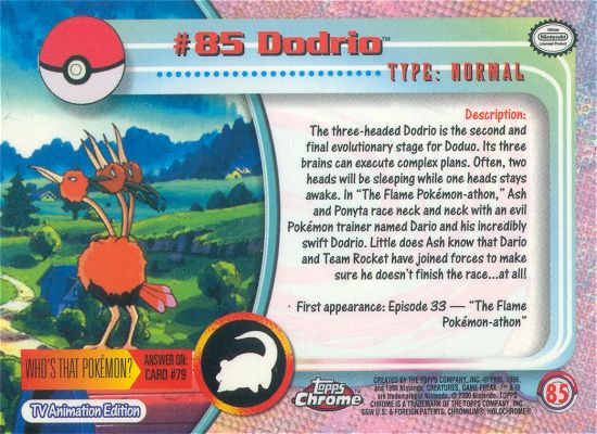 | Card text | The three-headed Dodrio is the second and final evolutionary stage for Doduo. Its three brains can execute complex plans. Often, two heads will be sleeping while one heads stays awake. In "The Flame Pokémon-athon," Ash and Ponyta race neck and neck with an evil Pokémon trainer named Dario and his incredibly swift Dodrio. Little does Ash know that Dario and Team Rocket have joined forces to make sure he doesn't finish the race...at all! First appearance: Episode 33—"The Flame Pokémon-athon" |