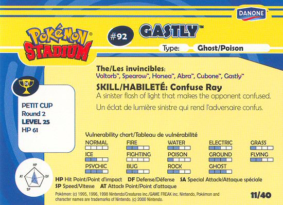 | Card text | The invincibles: Voltorb, Spearow, Horsea, Abra, Cubone, Gastly Skill: "Confuse Ray- A sinister flash of light that makes the opponent confused." |